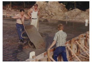 1985 begannen die umfangreichen Arbeiten an dem Vereinsheim. 2500 Arbeitsstunden wurde durch unsere Vereinsmitglieder und andere Helfer geleistet. Die Gesamtkosten betrugen 130.000,00 DM wobei die Abwasserentsorgung und die Stromversorgung einen beachtlichen Teil ausmachten. Insgesamt erhielten wir Zuschüsse in Höhe von 48.000,00 DM. Außerdem mußte ein Darlehn in Höhe von 13.000,00 DM aufgenommen werden. Am 10.09.1989 fand dann nach 4-jähriger Bauzeit die Einweihung statt. Wegen der umfangreichen Eigenleistungen und teilweise auch finanziell bedingt, ergab sich die relativ lange Bauzeit. Für seinen unermüdlichen Einsatz während der Bauzeit ist dem seinerzeitigen Vorstandsvorsitzenden Alois Susenberger zu danken. Hier ein paar Bild die während der Bauarbeiten aufgenommen wurden.