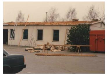 Ein weiteres herausragendes Ereignis in der Vereinsgeschichte, war als der Vorstand sich 1984 dazu entschloss auf dem Sportplatz in Beltheim ein Vereinsheim zu bauen oder ein entsprechendes Gebäude (Fertigbauhaus) zu kaufen. Man wurde fündig auf dem Werksgelände der Firma Lamy in Heidelberg. Der damalige Vorstand unter dem Vorsitz von Winfried Bläs kaufte das Gebäude für 5.000,00 DM. Es wurde dann in Heidelberg abgebaut und nach Beltheim transportiert und dort dann wieder aufgebaut. Hier ein Bild von unserem Vereinsheim als es noch auf dem Gelände der Firma Lamy in Heidelberg stand.