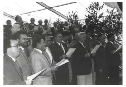 Es waren viele ehemalige Spieler anwesend, die jetzt nicht mehr in Beltheim wohnen. Die weiteste Anreise hatte ein Spieler der jetzt seinen ständigen Wohnsitz in Spanien hat. Wohl der bewegenste Moment war, als nach dem Festakt am Sonntag morgen, Lorris Helmut seine “Quetsch” auspackte, und mit den Mitgliedern die geehrt wurden, alte Beltheimer “Fußball-Schlachtgesänge” anstimmte. Wie man auf den nächsten Bilder sehen kann.