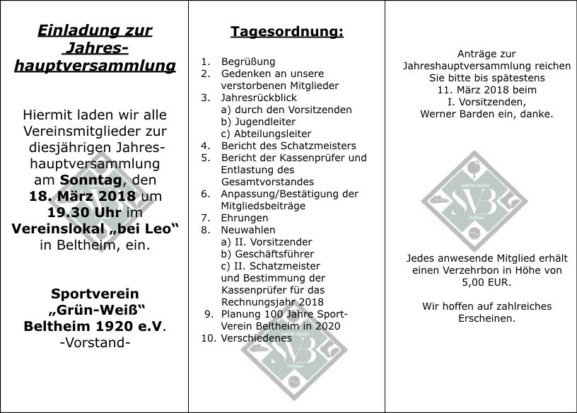 Am 07.01.2018 lädt der SV Beltheim alle Mitglieder ab 10:00 Uhr zum Vereinsbrunch ins Jugendheim Beltheim ein. Nähere Infos und das Anmeldeformular sind auf dem entsprechenden Einladungsschreiben zu finden.