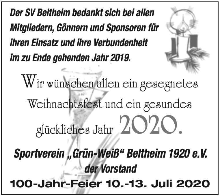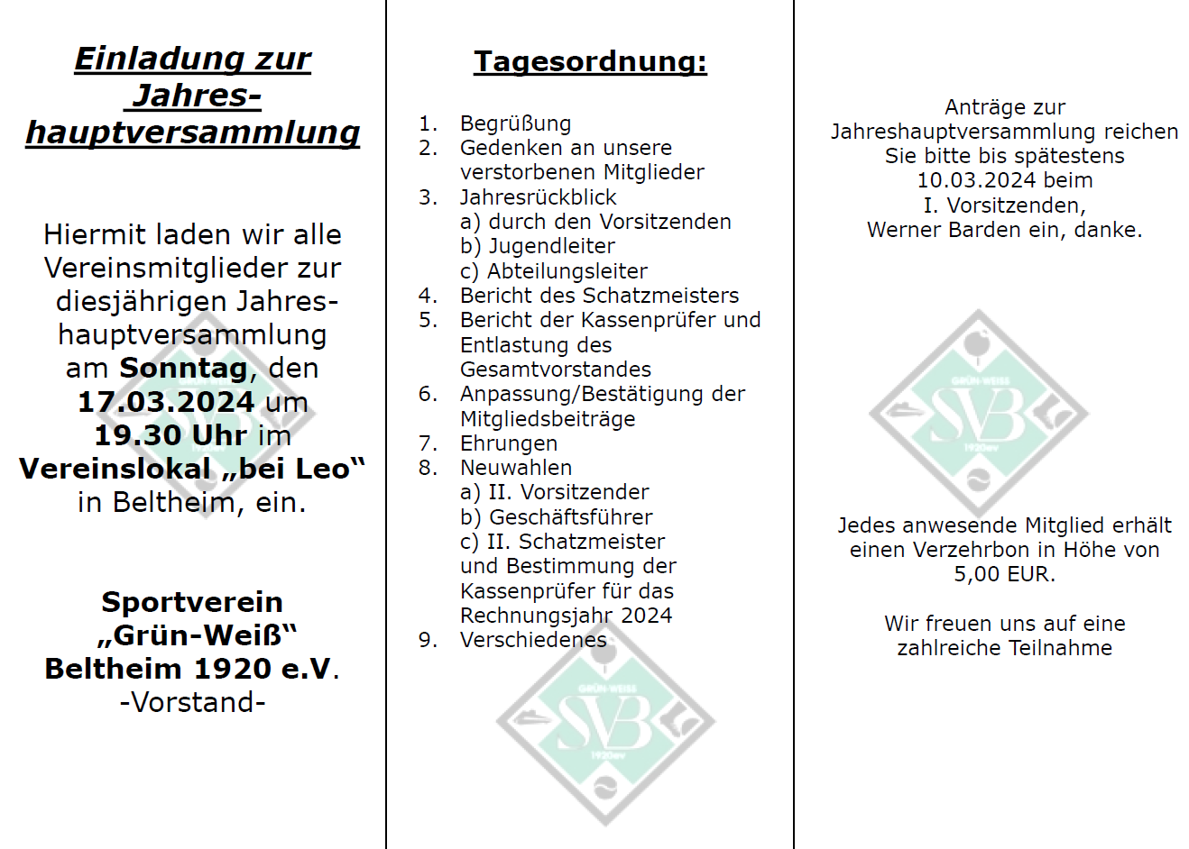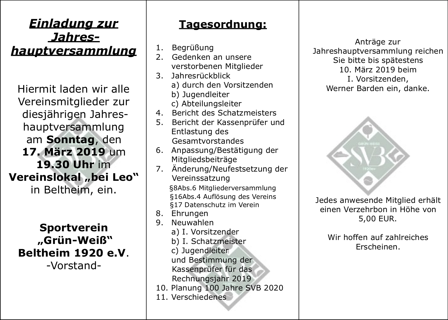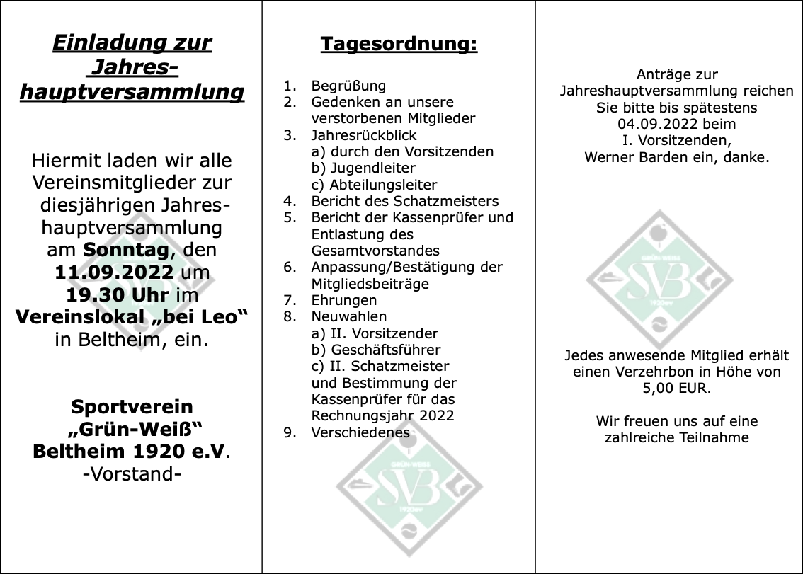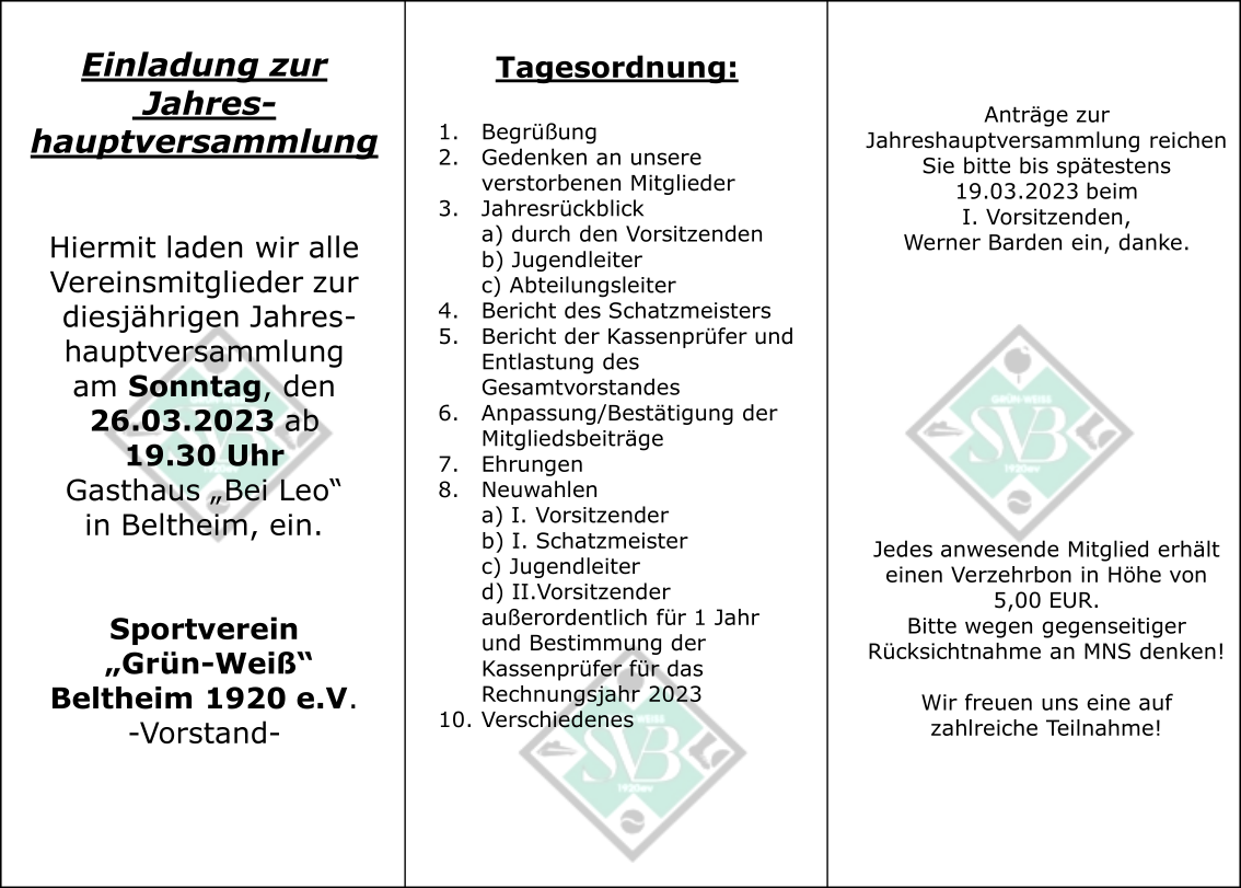 Am 26.01.2020 lädt der SV Beltheim alle Mitglieder ab 10:00 Uhr zum Vereinsbrunch ins Jugendheim Beltheim ein. Nähere Infos und das Anmeldeformular sind auf dem entsprechenden Einladungsschreiben zu finden.