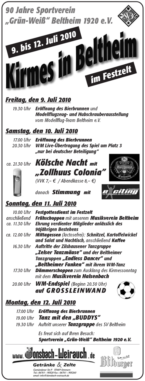 Die Kirmes 2015 findet vom 10.7. bis 13.7.2015 im Jugendheim Beltheim statt. Es erwartet euch auch dieses Jahr wieder ein neu zusammengestelltes Festprogramm für Jung und Alt:
