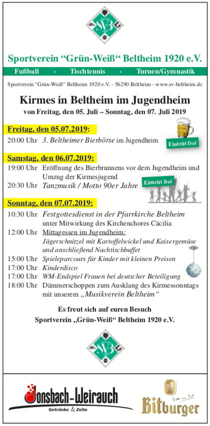 Die Kirmes 2019 findet vom 5.7. bis 7.7. im Jugendheim Beltheim statt. Unter anderem wartet die 3. Beltheimer Bierbörse und eine 90er Party zum Tanzen auf euch...