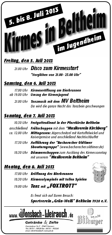 Die Kirmes 2013 findet vom 5.7. bis 8.7.2013 im Jugendheim Beltheim statt. Es erwartet euch dieses Jahr ein neu zusammengestelltes Festprogramm für Jung und Alt.
